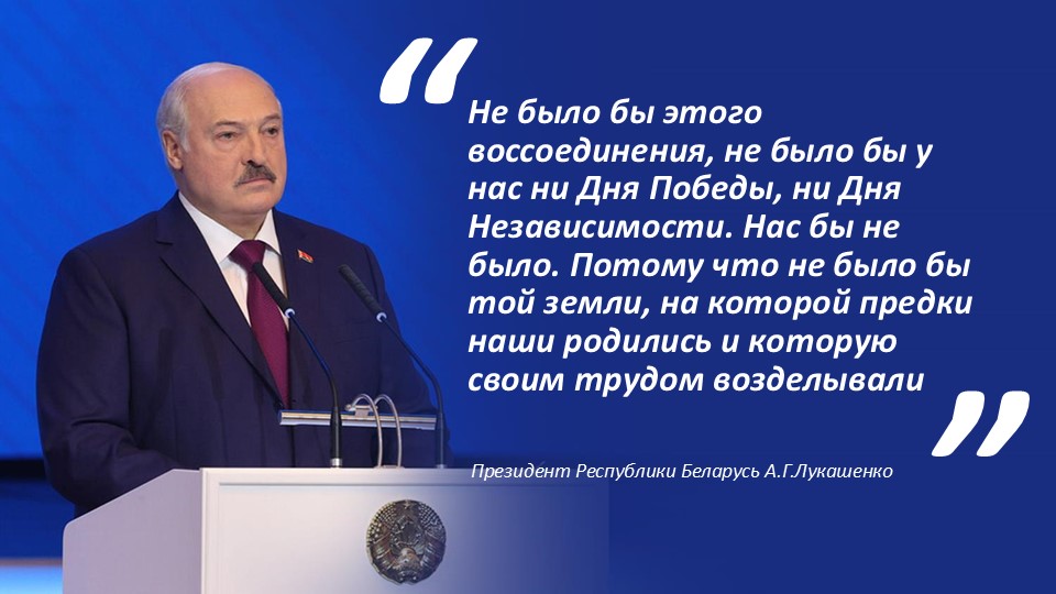 День народного единства – это один из важнейших праздников Республики Беларусь, значение которого с каждым годом только возрастает. Как отметил Глава государства А.Г.Лукашенко, «не было бы этого воссоединения, не было бы у нас ни Дня Победы, ни Дня Независимости. Нас бы не было. Потому что не было бы той земли, на которой предки наши родились и которую своим трудом возделывали».