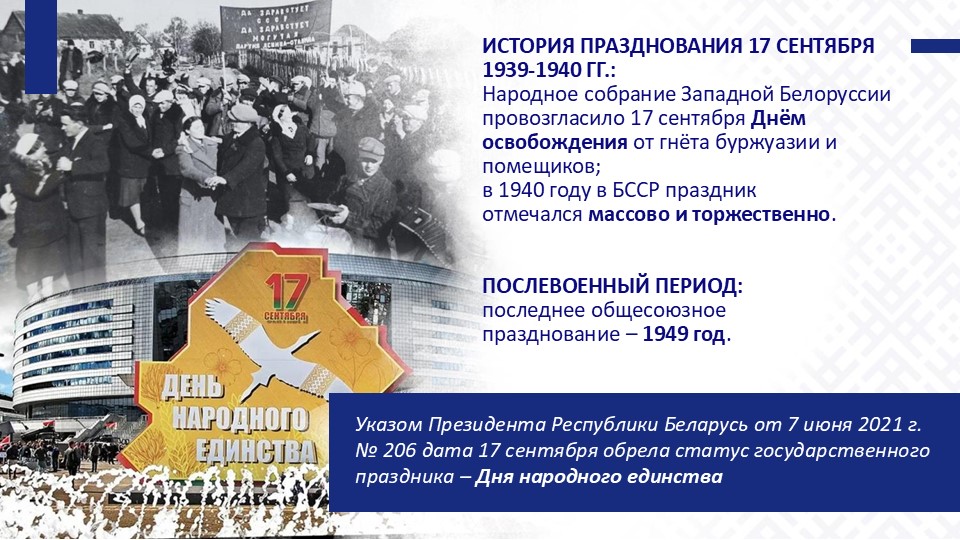 Логично, что Указом Президента Республики Беларусь от 7 июня 2021 г. № 206 дата 17 сентября обрела статус государственного праздника – Дня народного единства.