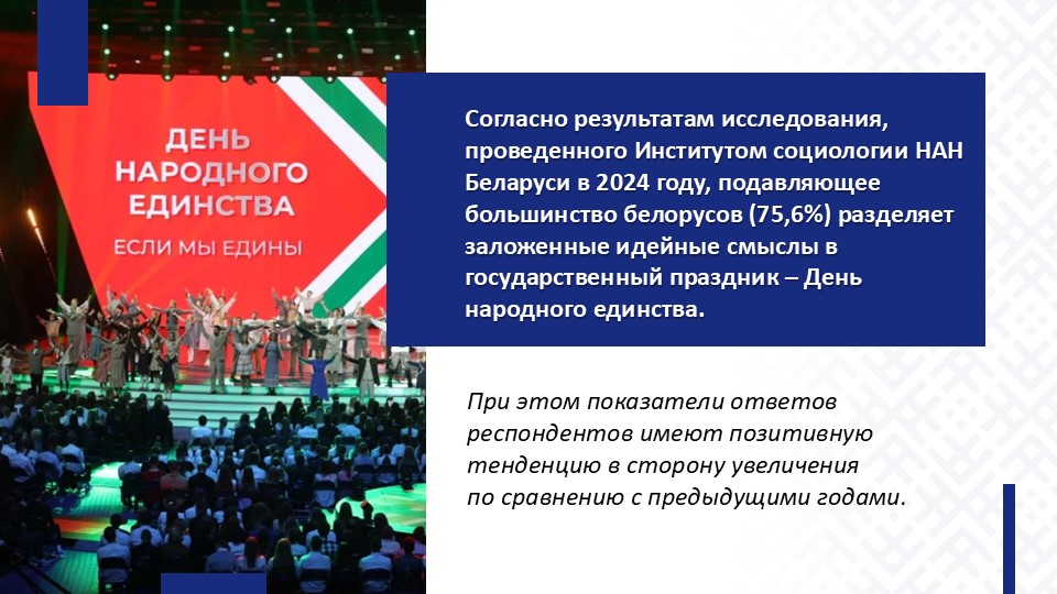В значимости консолидации белорусского общества для сохранения государственности сегодня уже не нужно убеждать никого. Многочисленные испытания, выпавшие на долю белорусского народа, дают основания по-особенному относиться к такому понятию, как народное единство. Государственный праздник День народного единства имеет особый смысл: пока мы едины, мы непобедимы. Важно сохранить мир и страну для будущих поколений.