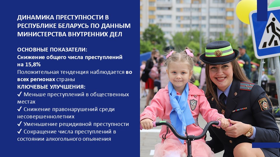 Достигнутый в Беларуси уровень комфорта и безопасности стал брендом страны. У нас нет разгула преступности, мы спокойны за безопасность наших детей и близких. Пользуемся равными правами и возможностями, которые предоставляет нам сильное социальное государство. И для нас это норма.