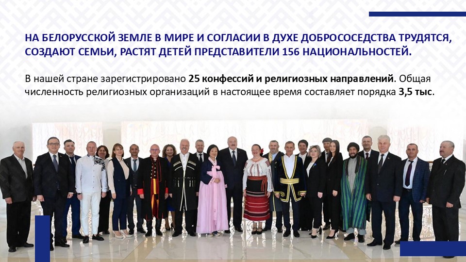 «В своей новейшей истории белорусская земля не знала разногласий, преследований по религиозному, национальному, расовому признаку. Все конфессии живут здесь в атмосфере взаимного уважения, мира и согласия. В наши дни это удивительно для многих, в том числе так называемых цивилизованных, стран. Сосуществование христианства, ислама, иудаизма и других религий, основы которых не противоречат глубинным ценностям белорусского общества, сплотило и закалило белорусскую нацию», – подчеркнул Глава государства А.Г.Лукашенко 10 февраля 2025 г. в ходе встречи с представителями религиозных конфессий.