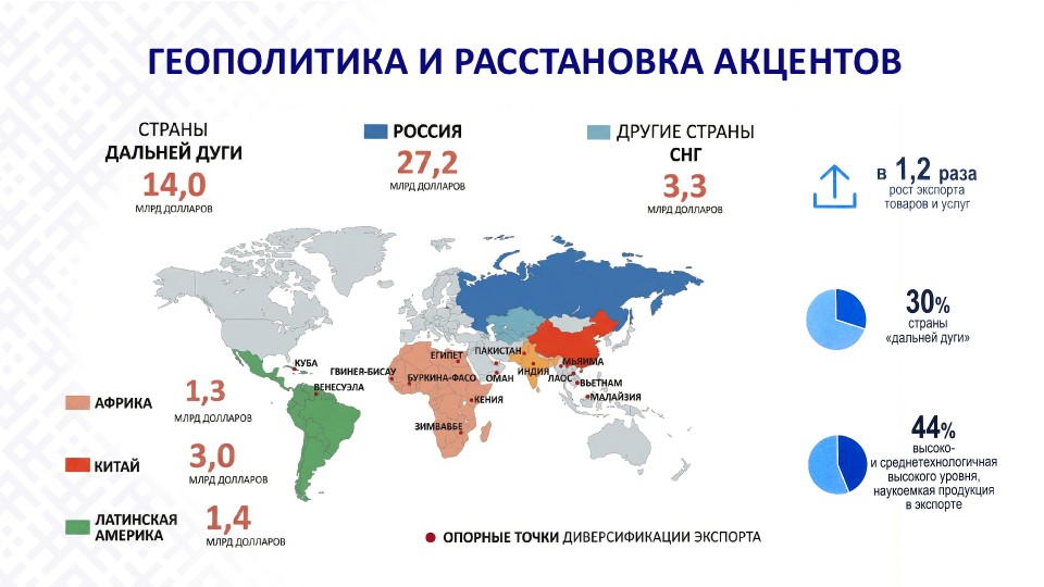 Мы увеличили долю стран дальней дуги в нашем экспорте с 11 % (2021 год) до 20 % в 2024 году. Вместе с тем треть белорусских поставок за рубеж должна находить покупателей в Азии, Африке и Латинской Америке.