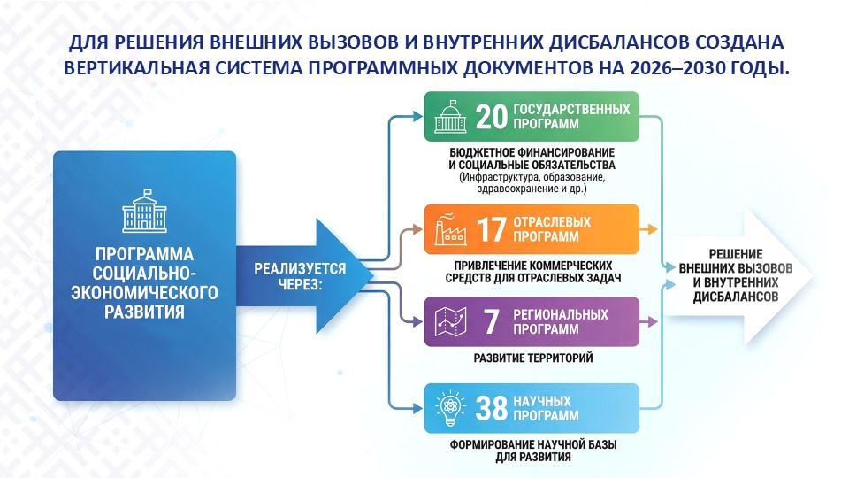 Одним из важнейших политических событий прошедшего года стало проведение 18–19 декабря 2025 г. второго заседания седьмого Всебелорусского народного собрания (далее – ВНС, Собрание), в ходе которого Президент Республики Беларусь А.Г.Лукашенко обратился с Посланием к белорусскому народу и Национальному собранию (далее – Послание) и была утверждена Программа социально-экономического развития на 2026–2030 годы (далее – Программа).