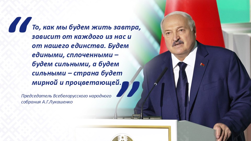 Подводя итоги второго заседания седьмого ВНС, Председатель Всебелорусского народного собрания А.Г.Лукашенко особо отметил: «То, как мы будем жить завтра, зависит от каждого из нас и от нашего единства. Будем едиными, сплоченными – будем сильными, а будем сильными – страна будет мирной и процветающей».