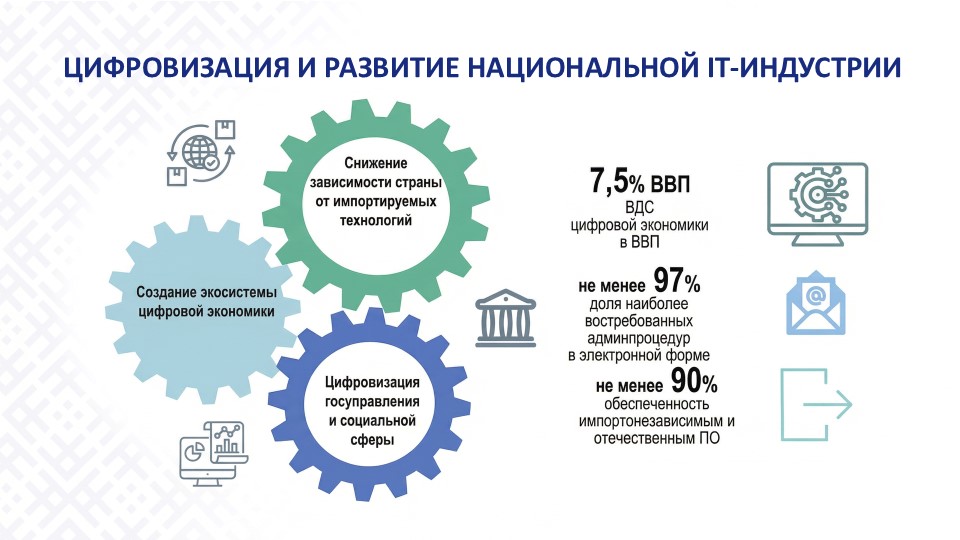 Необходимо ликвидировать уязвимость национальной IT-индустрии. Президент подчеркнул, что критические отрасли должны быть обеспечены импортонезависимым программным продуктом минимум на 90%. Все для этого есть: правовое поле, инфраструктура, школа подготовки IT-специалистов, Парк высоких технологий.