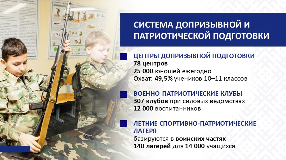 На сегодняшний день в стране действует 78 центров допризывной подготовки, которые посещают около 25 тыс. юношей (49,5% от всех юношей 10–11 классов).