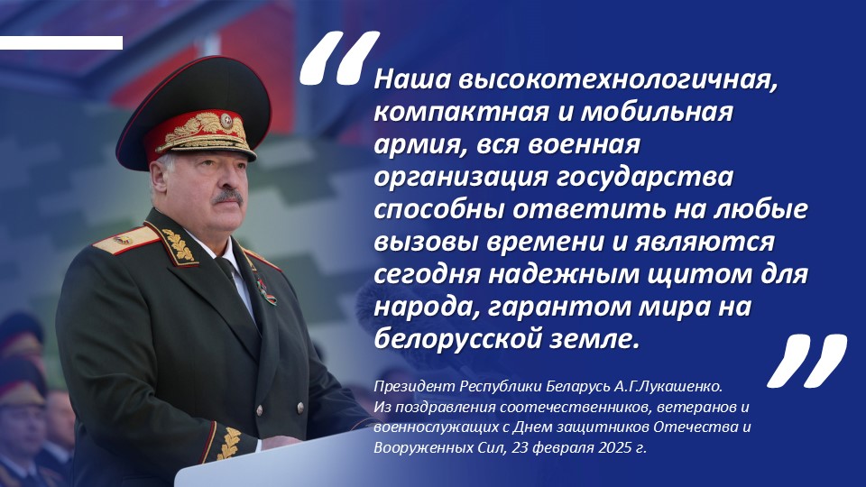 Поздравляя соотечественников, ветеранов и военнослужащих с Днем защитников Отечества и Вооруженных Сил в 2025 году, Президент Республики Беларусь А.Г.Лукашенко особо отметил: «Наша высокотехнологичная, компактная и мобильная армия, вся военная организация государства способны ответить на любые вызовы времени и являются сегодня надежным щитом для народа, гарантом мира на белорусской земле».