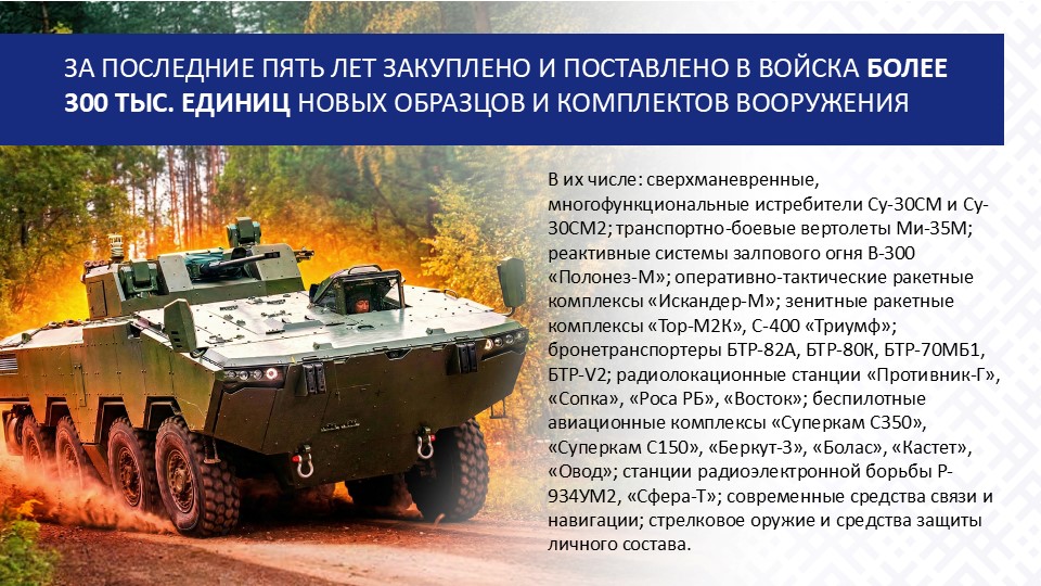 Уделяется должное внимание как тактической и оперативной подготовке, так и оснащению армии новыми, наиболее современными, отечественными системами и образцами вооружения, а также поставляемыми союзной Россией. Это свидетельствует о том, что у нашей страны нет агрессивных намерений, нет построения наступательного потенциала. Вместе с тем необходимая достаточность оборонительной мощи обеспечена.