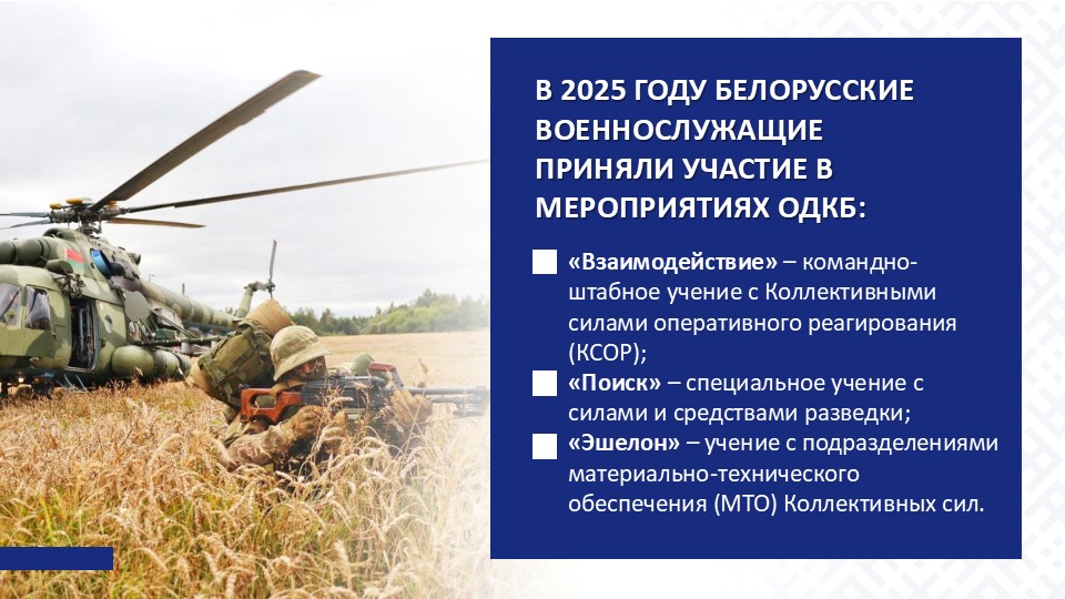 Основываясь на системном анализе военно-политической обстановки и ее прогнозе, Беларусь продолжает развивать собственные Вооруженные Силы и адаптировать их к реагированию на любую ситуацию, которая может сложиться.