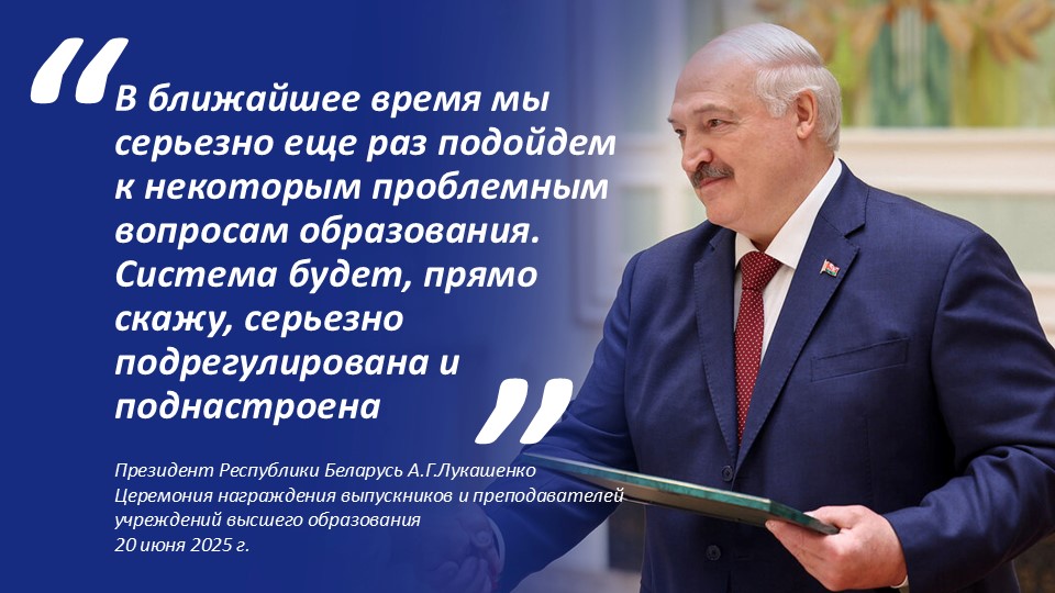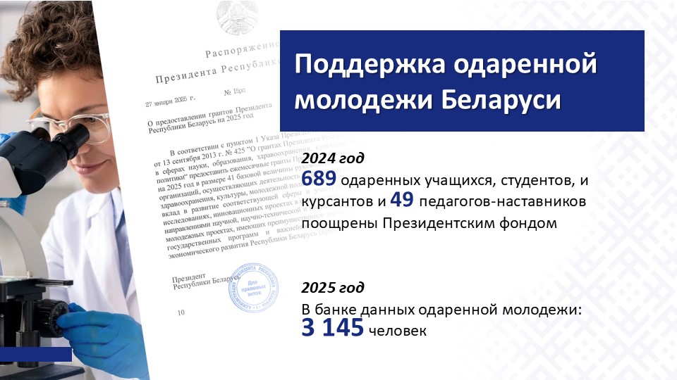 Особое внимание уделяется государственной поддержке одаренных учащихся и студентов. Действует специальный фонд Президента Республики Беларусь по социальной поддержке одаренных учащихся и студентов, из средств которого 17 июля 2025 г. назначены очередные стипендии 192 студентам УВО назначены стипендии Президента. Гранд-премий с присвоением звания лауреата специального фонда удостоены 28 победителей международных олимпиад и конкурсов.
